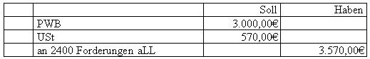 (1)Zum Beginn es Geschäftsjahres haben Sie einen PWB-Bestand von 5.000€. Eine Ihrer Einwandfreien Forderungen aus dem Vorjahr wird uneinbringlich (brutto 3.570€). Buchung!