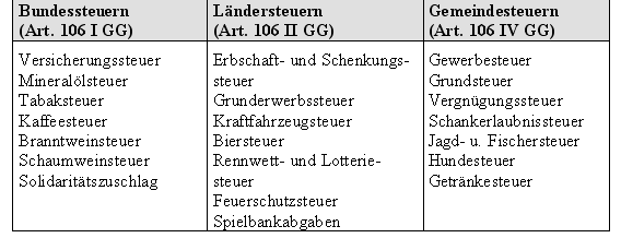 Die Steuerarten werden, wie folgt, auf Bund, Länder und Gemeinden zugeordnet:
